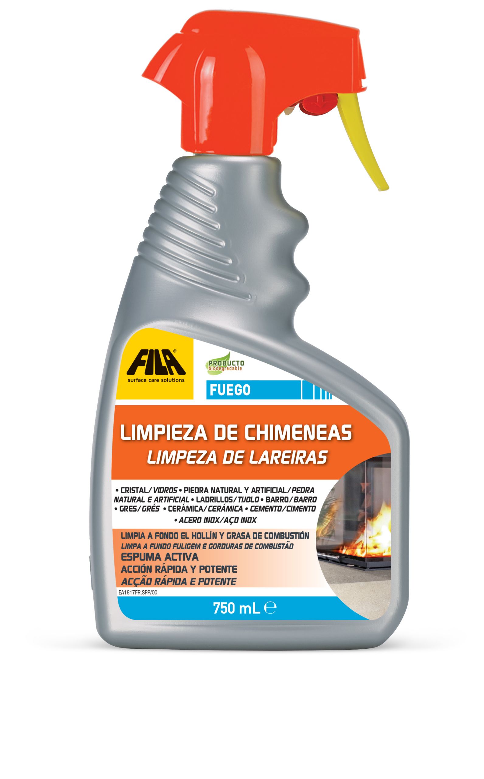 Espuma en spray detergente elimina hollín, especifica para la limpieza de cristales y revestimientos de estufas y chimeneas.