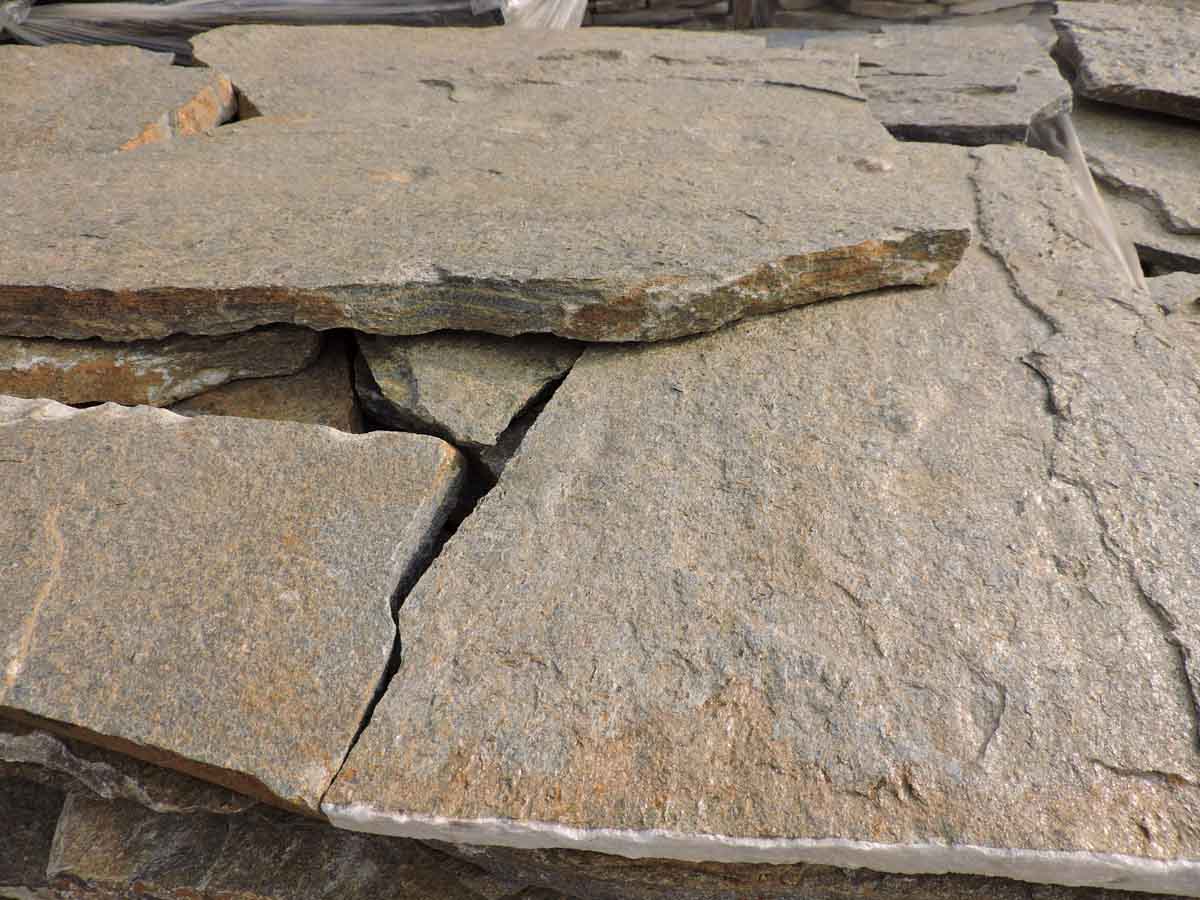 Cuarcita muy resistente de tono marrón mezclado con algún tono azul, con la peculiaridad que lleva mica y brilla al sol.